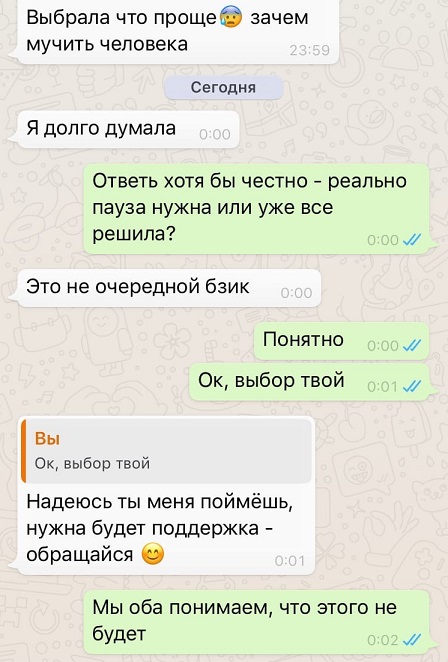 А судя по прощальной переписке, хотя нельзя судить по двум скринам, но все же, в этот день поинтересовалась твоими делами только она. А ты даже не узнал, как ее день, перед тем, как она ушла спать.