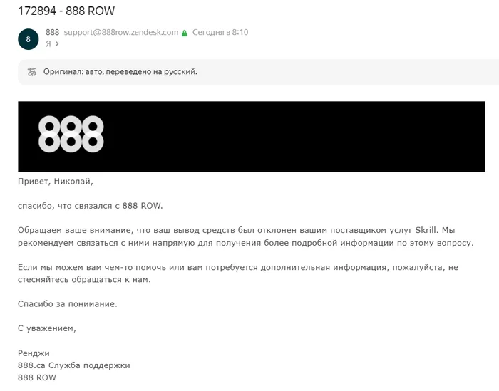 Апдейт по моему кейсу. После общения со службой поддержки Skrill и уточнения, что на мой аккаунт дополнительных ограничений произведено не было, отправил скрины в пт 888, они ответили что поставили деньги повторно на вывод на Skrill. Через 3 дня деньги вывели всё-таки. Так что резюмируя вывод напрашивается один - долбить тп пока не выведут, иначе будут кормить отмазками.