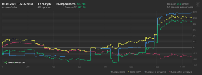 07.06.2023: 3.07ч, 1476 рук nl10/25 +$103.