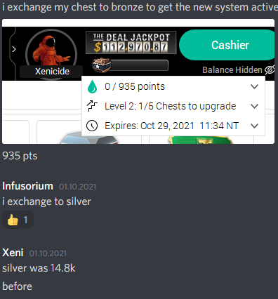 Infusorium @ 03.10.21про "сразу же присоедениться к новой программе на 1 уровень ниже вашего текущего" - пиздежь. У меня был на четверть сделаный золотой сундук по старой системе в 48500, откатил до серебрянного и он был по цене в 17к или сколько там, а должен был быть по 2700.