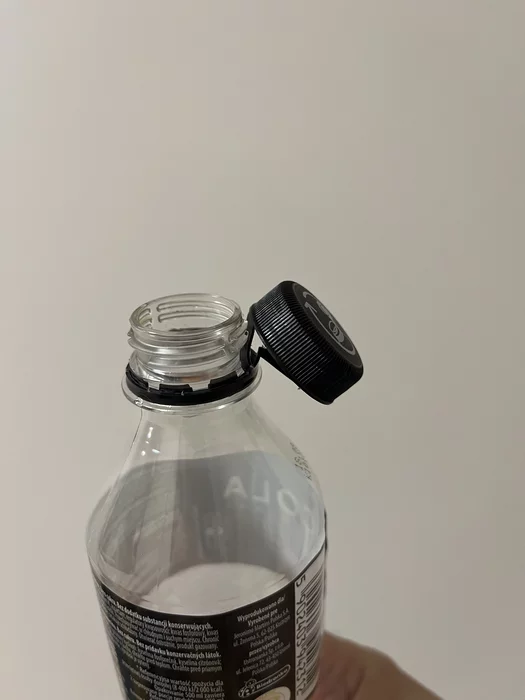 Пластмассовая крышка при открывании напитка не может отрываться, а должна составлять с бутылкой единое целое.