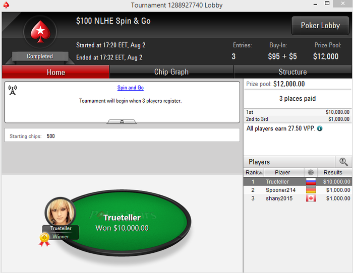 Poker Stars $14.25+$0.75 No Limit Hold'em Tournament - t40/t80 Blinds - 2 players