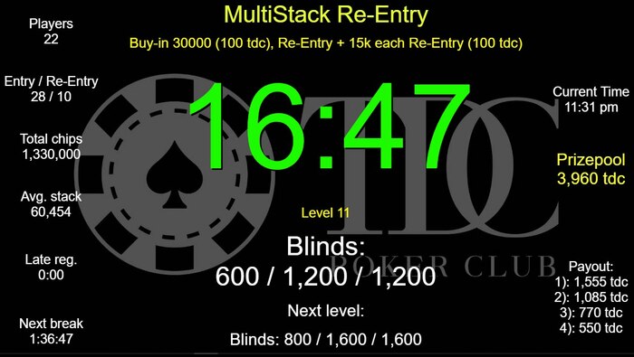 Играл за $25 этот турик, вылетел за полтора уровня до аддонов, за ребай давали 10бб, ребаиться не стал. Сегодня в казино не поеду, завтра на такой же реентри за $100 поеду, как позавчера затащил.