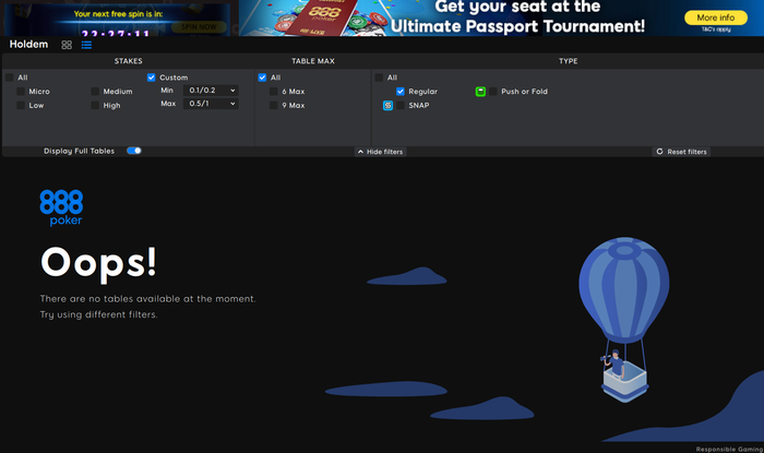 За последние несколько дней мы столкнулись с техническими неполадками, из-за которых лобби 888poker было подвержено лагам или становилось временно недоступным в часы пик. Мы понимаем, насколько это негативно влияет на пользовательский опыт и приносим искренние извинения за доставленные неудобства!