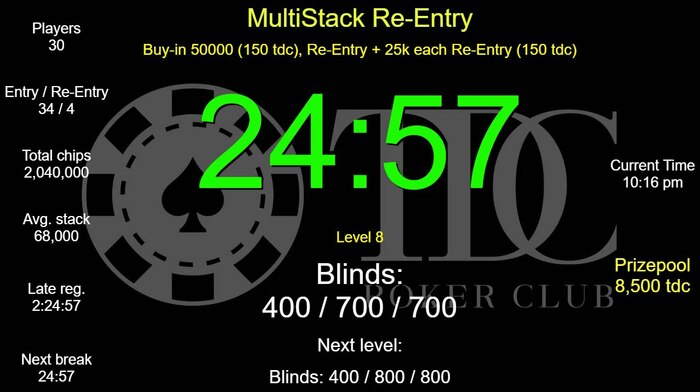 Может поедем в другое казино на мультистек реентри по $150, если тиммейт вылетит, офигенный турнир по структуре, гарантия $8500, небольшой оверлей там будет, скорее всего, пока так ситуация: