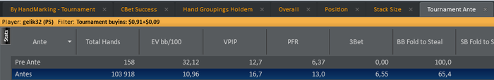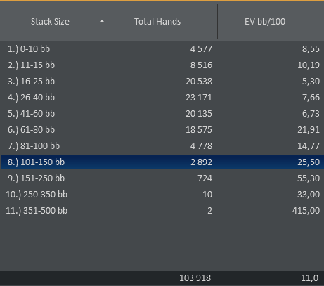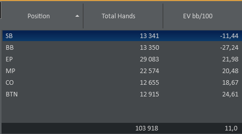 Если учесть что в начальной стадии мы играем тайтово, а в поздней лузово, то мы уже с первой раздачи теряем EV bb/100. Поэтому при текущей структуре на дистанции более 100К рук - этот показатель не может превысить более 10. Есть теория, текущая структура наоборот занижает винрейт.