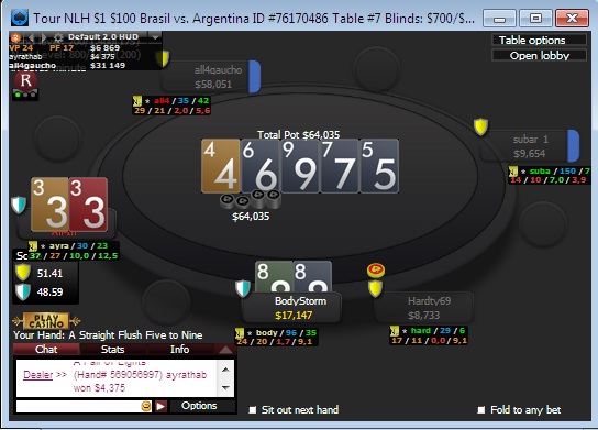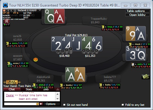Промежуточный итог не совсем порадовал, ожидал лучшего, но я явно был слабее в ХА, и на выставлении чувак на флопе закрыл 33 мою пару 88 и поймал на терне 3