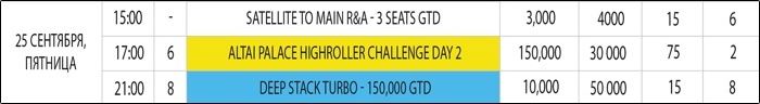 В 21:00 - традиционный Deep Stack Turbo. Мы удваиваем ставки! Вступительный взнос - 10,000 рублей. Стартовый стек - 50,000 фишек. Уровни по 15 минут. Поздняя регистрация и ребай - в течение первых восьми уровней. Гарантия в 150,000 обещает серьезную борьбу, а глубокий стек - содержательный покер...