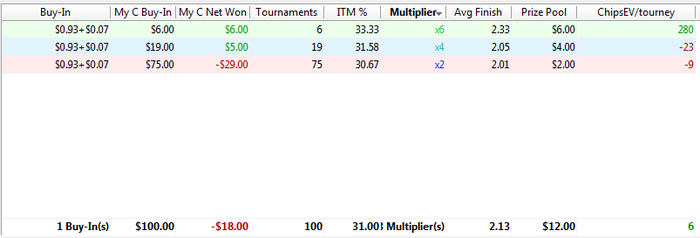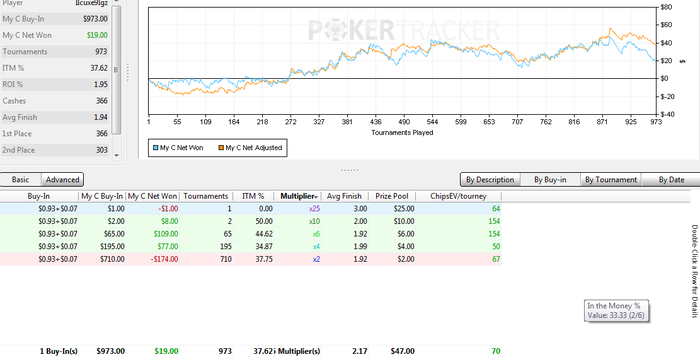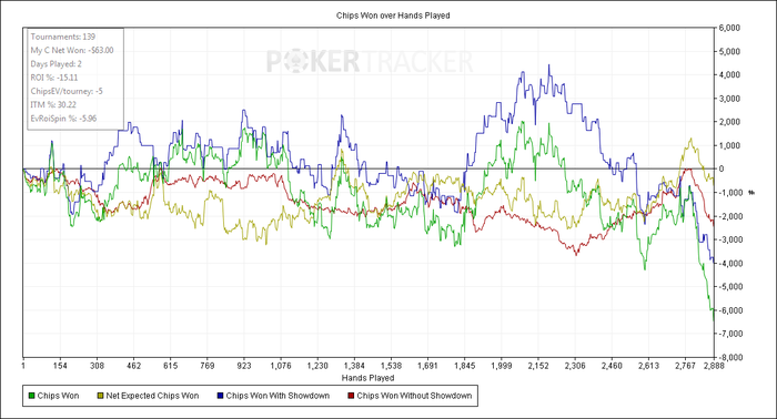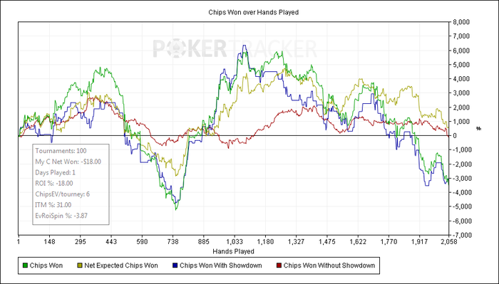 Немного мыслей по поводу работы над игрой. Очень много думал об этом, хотел ставить программы,но есть одно огромное НО. Почти все эти программы дают расчёты с учётом предполагаемых диапазонов оппонентов. То есть , что бы разбирать конкретные раздачи и находить в них лики, необходимо задать оппоненту предполагаемый диапазон его коллов, пушей. Но как это сделать, абсолютно ничего не зная об оппоненте? Ответ прост - НИ КАК. В теории получается, что каждый турик с неизвестными оппонентами мы играем, можно сказать, на удачу. Да. можно наблюдать за оппами в процессе и делать какие то выводы. Можно быстро определить новичков по дебильным сайзингам,отсутствию мультитейблинга и так же находить регов по определённым признакам, но даже такой внимательный подход к каждому турниру не даёт вообще никаких гарантий на стабильную плюсовую игру. Можно показывать отличный результат по ЕВ и быть в полной жопе по факту, можно наоборот играть против ожидания и показывать хороший факт. Насколько я могу судить, невозможно показывать профессионализм на огромных по кол-ву народа полях, где просто невозможно собрать статистику на оппов и подобрать против них эксплуатационные (еле выговорил) линии от которых и зависит напрямую наше ожидание. Вывод я сделал следующий : Не суть важно как играть. Хоть на красную, хоть на синею , хоть барели, хоть чекай, хоть чек-рейзи, хоть лимп-пуш, хоть чё угодно, стабильный профит в этом сверхдисперсионном формате покера можно получать только за счёт рб. Все лимиты бьются, только как я думаю, что бы понять бьёш ты их или нет, нужны разные дистанции на разных лимитах. Скажем на 60-ках народу играет куда меньше, чем на 3-ках ясен пень и там дистанция нужна куда меньше,что бы определить как ты сидиш в этом поле, для работы над игрой. А на 3-ках? Бесконечный поток новых лиц, у которых абсолютно непонятно что творится в голове и поэтому мы можем лиш пальцем в небо тыкать, выставляясь в монетках или вскрывая чей то "блеф", который невозможно предугадать ничего не зная об оппоненте или делая выводы из его действий в текущем турнире (что не совсем рационально). Вообщем плюсуеш только за счёт неадекватов колящих J4o на префлопе на 20+ББ (таких полно), которые не знают даже банального эквити своей руки. И чем выше лимит, тем больше адекватного народа, против которых и необходимо работать над игрой, постоянно придумывая велосипед в стиле "я знаю, что он знает,что я знаю" А на микро полях проще играть стандартно и терпеть дисперсию, не думая ни о чём.