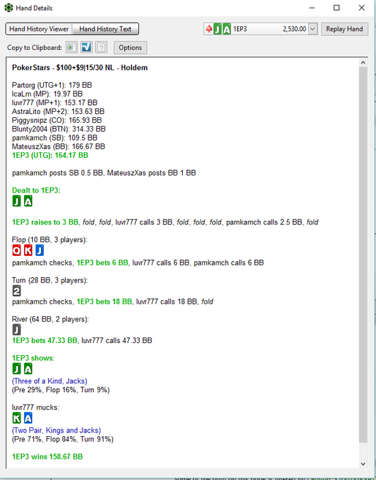 Вот я и проанализировал все свои воскресные турниры.Всего подробному анализу подлежало около 200 рук из 3к.Игрой остался доволен, прогресс вижу, а это главное.