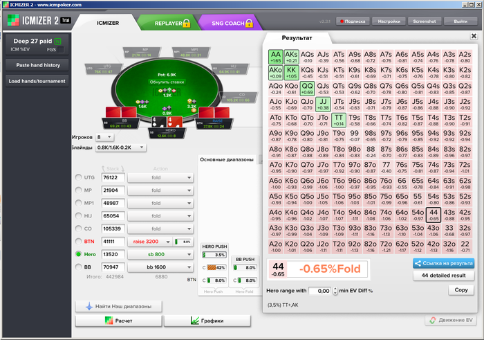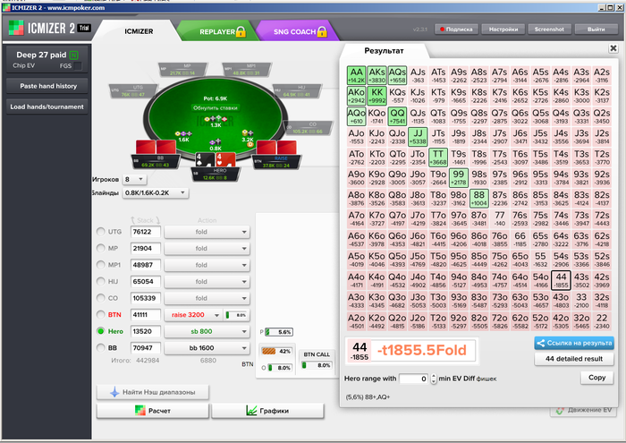 Бтн - плюсовый рег микро и низких лимитов. На лимп от фиша он может пушить всё, что угодно, учитывая его фолд на 3бет в 100% при 4 ситуациях.