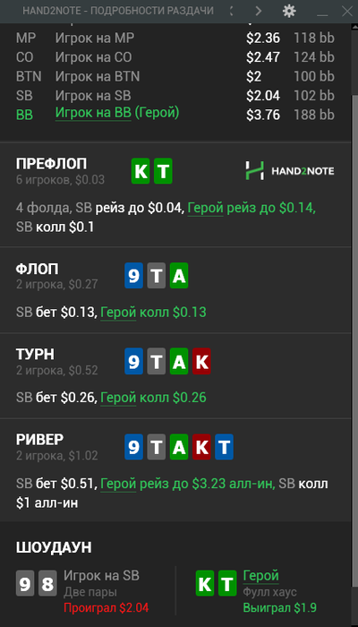 ну тут сразу по префлопу, возможно,моя ошибочка - по сайзингу 0,24 маловато? лучше 0,26? с другой стороны мы в позе, не так это и критично, но на сб, если бы я был, то точно 0,26,а то и 0.28 надо ставить. Ну чек-рейз олл-ин и мой колл опровергают все то, что я писал выше, что учусь выбрасывать на крупные чек/рейзы на нл2