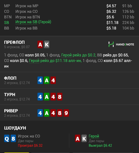 тоже было бы интересно услышать мнение Выборка на оппа в несколько тысяч рук - там total 4 бет 1.8, по всем позам у меня нет 4бета (а надо бы сделать), но глянул его 4 бет на бу и сб - 4.7! То есть в мп позе какой мы ожидаем увидеть 4бет? ну..наверное в лучшем случае тот же 1.8, а это АА-QQ , АКs. Короче,увидел я 4-бет и опечалился. Выставляться совсем не хотелось, мы проигрываем в эквити по его диапазону, очевидно, почти уверен, что свой низ диапазона АК и QQ он не выкидывает, то есть фолд эквити там нет. Но и мне выкидывать АКs это пиздец!! камон, у меня рука не поднимется