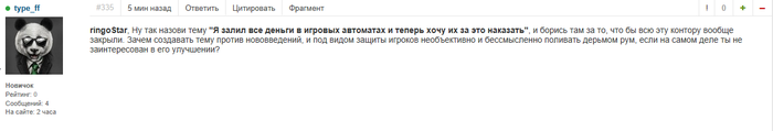 ringoStar, Ну так назови тему "Я залил все деньги в игровых автоматах и теперь хочу их за это наказать", и борись там за то, что бы всю эту контору вообще закрыли. Зачем создавать тему против нововведений, и под видом защиты игроков необъективно и бессмысленно поливать дерьмом рум, если на самом деле ты не заинтересован в его улучшении?