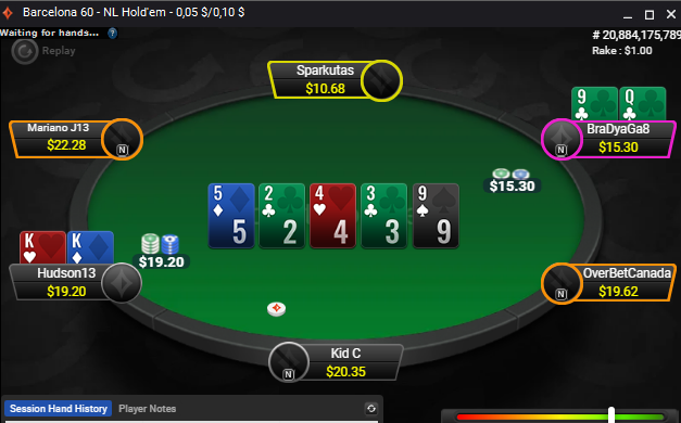 Я опасался, что он свалит со своим выигрышем, что было бы разумным решением. Но большой выигрыш не поменял его стратегию и он продолжил свою обычную пиханину на префлопе. Естественно, он удвоил почти всех за столом.