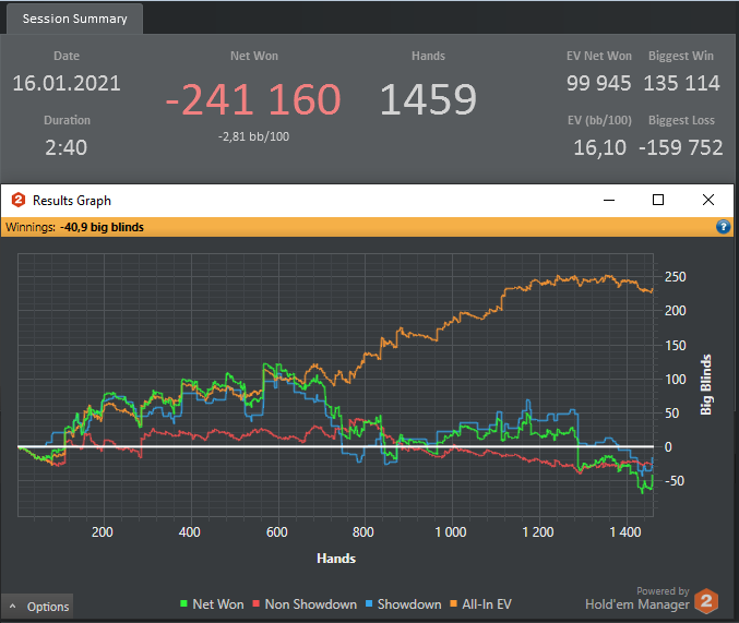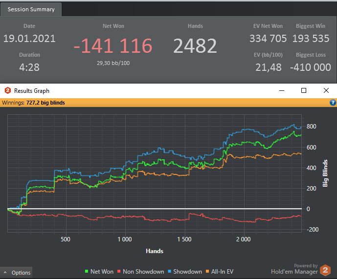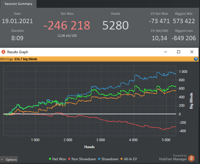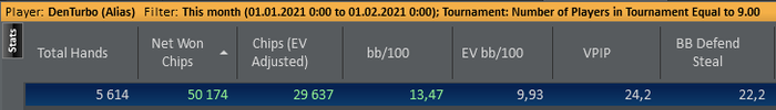 Вчера и сегодня утром сыграл первые две полноценные сессии на Кинге. Также уже прошло две групповых тренировки по СНГ с Евгением Madjer23 Отличный тренер и хороший человек! Очень рад, что попал к нему в группу! По ощущениям, даже после двух тренировок есть хороший "буст" Дистанция естественно мизерная, да и переапался, конечно. Но хотелось бы отметить, что я, наконец, достиг VPIP=24%, хотя до этого долго не мог этого сделать, правда для одностоловых этого похоже мало, так что буду работать и дальше, над расширением этого показателя. Ну и впервые, даже за такой короткий промежуток, я в плюсе по чипЕВ! Также хочу выразить благодарность ещё одному хорошему человеку, тоже Евгению, Stupi 08, за то что разобрал мою базу рук, и записал несколько теоретических видео для меня, указав на мои множественные лики в игре! Большое человеческое спасибо!!!
