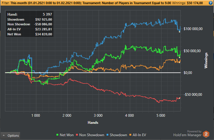 Оформил, лучший месяц в этом году! 40% профита - от катки, 60% - за счёт РБ и бонусов. Также достиг рекордного среднего бай-ина: ну чуть недотянул до АБИ=5. По дистанции, получилось совсем немного. С 19 декабря не катал. Накопилось много дел оффлайн, которые нужно было обязательно закончить до НГ. "Потерял", конечно, некоторую часть бонусов за это время, но зато "приобрёл" в других сферах. Не одним покером живы. Продолжаю играть одностоловые СНГ и Он-Деманды на Кинге. Уже уверенно держусь на "пятёрках" и даже делаю вылазки на "десятки"!