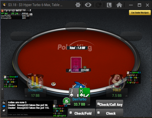 Сыграл всего 7 туриков, а профитнул аж +67$ В общем получилось так, что вчера, с семи вечера до двух утра, длилась покерная тренировка. Часам к трем, передохнув, я настроился на плотную катку, решив отыграть хотя бы туриков пятьдесят до "мёртвого часа" на Кинге. Сыграв несколько рук, я понял: "что-то не так". Сморю, а на Покер Кинг ХАД ХМ2 не работает! И тут я вспомнил, что вчера вышло обновление, и я даже в клиент полчаса не мог зайти, то залогиниться не мог, то лобби пустое было. Пока я опомнился у меня уже открылось 6 столов, я начал колебаться, играть без ХАДа, что мне очень не понравилось, или попытаться по-быстрому всё исправить. Я отменил все остальные регистрации и начал доигрывать турики, параллельно переписываясь в чатах поддержки и на форумах в поисках ответа. В итоге никто нигде ничего толком не знал, и я сам начал ковыряться в настройках.