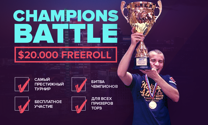 Друзья, каждый наш Гранд Финал не обходится без фриролла, в котором мы просто раздаем деньги триумфаторам RPT. В этот раз специальный ежегодный турнир Champions Battle для ТОП-3 призеров любых турниров RPT состоится 6 марта. Призовой фонд — $20.000.