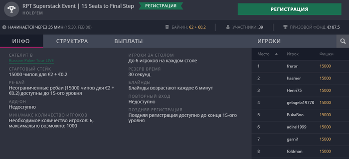 Уже через 10 минут стартует предфинальный сателлит к RPT Superstack Event с байином 2.2 евро на Vbet. На кону, как минимум, 15 гарантированных мест в сегодняшний финальный сателлит, который состоится в 21:00 МСК. На данный момент в турнире уже 39 регистраций, поздняя будет доступна до конца 15 уровня. Принимаем участие.