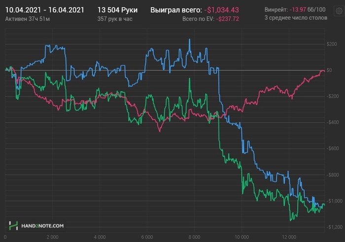 Отпустило меня спустя 2 недели страданий. Так хреново ни от одной болезни мне прежде не было. Параллельно играл на ГГ, как до болезни, так и после - начал с нл25, так как гонять бр между несколькими румами затея не из приятных, а то, что было в свободном распоряжении - несколько сотен; под конец задел 50. Что можно сказать... Катка сверхдисповая - каждый третий рег жмёт абсолютно рандомные кнопки. Оттого и сверхприбыльная, но это только если есть недюжинная выдержка и палаты терпения, а в кулаке сжимаются яйца. За 2 дня игры, норма для меня была спуститься до 300, подняться до 700 - и повторить это ещё раз. На секундочку, 16 би. Играя не так много и всего на 3-х столах зума. Терпилой быть мне не пристало, а пребывать в перманентном ощущении бесполезности и абсурда того, чем занимаюсь - тем более. Короче говоря, я зарёкся в жизни больше никогда не играть ни одной руки на этом руме.