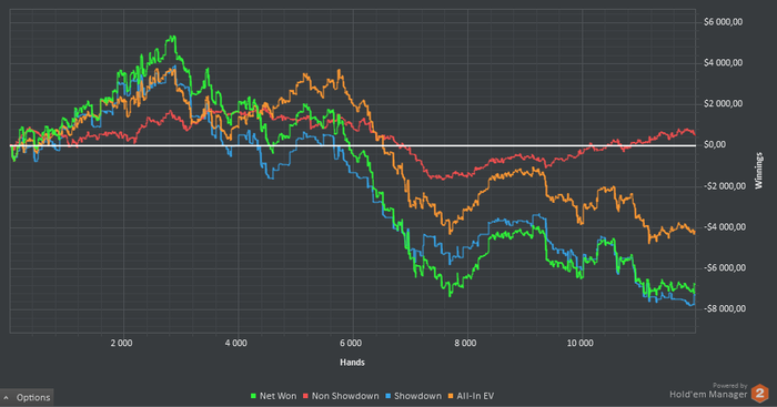 Особенно - посередине. Видите эту ебучую "лестницу в ад"? Это сессий 7 по 100-150 раздач на минус 2-3-4 стека.............. Зашёл, увидел, закрыл. Зашёл, увидел, закрыл. У вас когда-нибудь бывало, чтобы от тильта "плыли стены"? Думаю, многие поймут. Это когда пиздец приходит сразу после предыдущих пиздецов, быстро и в "несправедливых" количествах