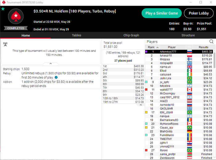 Теперь очень интересные случайности расскажу)) Ситуация , как вы знаете, у меня последние дни была совсем печальная(но я не лудил, лимиты у меня заблочены, просто катал дешево , турниры дороже 16.50 практически не грузил, ну и дисперсия вещь такая, что ну никак ничего положительгного для банкролла не происходило, гриндишь-гриндишь на микро, а бр чуть выше - чуть ниже ,плюс минус 200 долларов болтается, по итогу выходит нулевая игра, а деньги то кончаются, 3 человека как никак кушают.... сделал пару депозитов по 100 и по 50 долларов...ну и думал так же продолжать гриндить(в сат за 22 по чуйке прыгнул, было предчувствие, что надо блин, а так вообще чуйка ни чуйка, это было бы норм по играемым лимитам, так что все норм, я их иногда гружу)