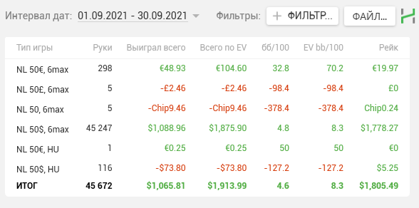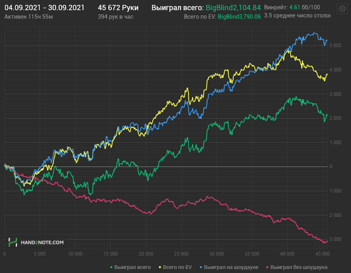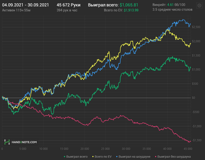 Месяц получился плюсовым и относительно общего затраченного времени на работу (всего 116 часов) неплохим по доходу, но я недоволен собой из-за небольшой дистанции (всего 45,5к рук). Да, для этого были объективные причины: вышел на работу (полставки, но все же), потом еще замещал несколько дней другого преподавателя (а из рабочего ритма вылетел на неделю) и в самом конце месяца выбыл на 4 дня из-за плохого самочувствия. Но ключевая причина в том, что не могу пока адекватно и быстро переключаться между двумя настолько разными видами деятельности и хорошо распределять время. После уроков вообще прихожу выжатый как лимон - в классах по 25-30 человек и приходится постоянно сдерживать весь этот бессознательный эгоизм. Заниматься покером потом уже не получается. Но ничего, буду считать, что сентябрь пошел на вхождение в нужную рабочую колею.