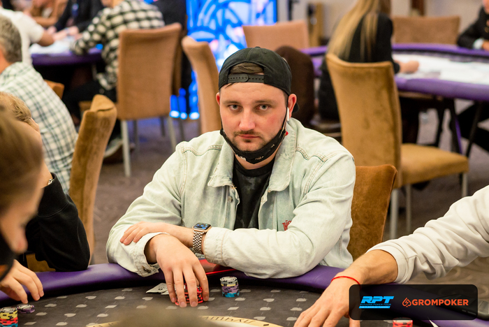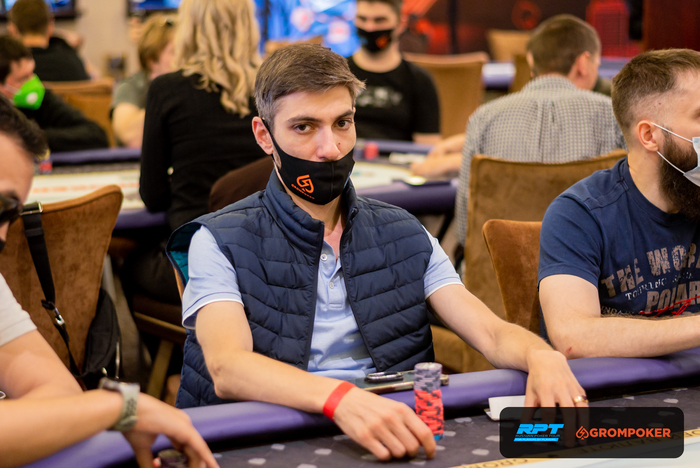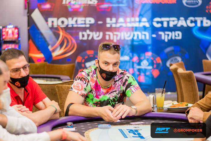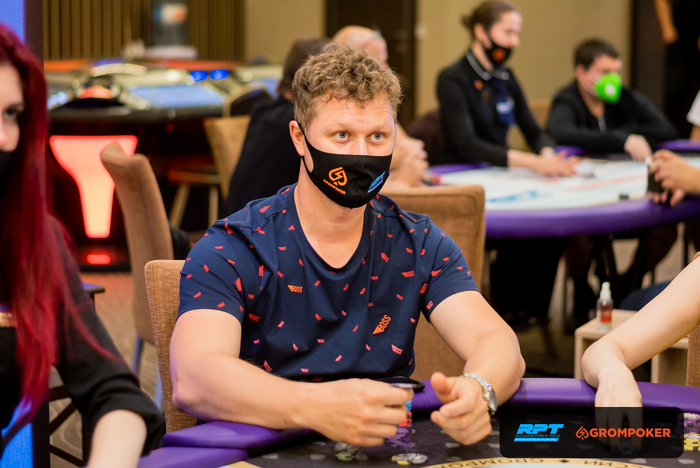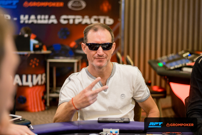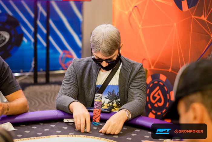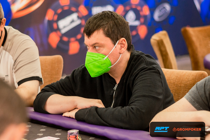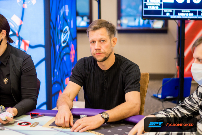 За соседним столом Андрей Голубев запушил из ранней и получил колл с от Олега Сергеева на ББ со стеком в 80К. Доска , Олег Сергеев также выбывает из турнира.