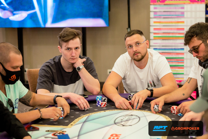 Антон Нечаев с баттона решает открыть раздачу рейзом 8К, Петр Руднев и Борис Топчиев на блайндах доставляют. , блаинды чекают, Нечаев ставит плотно 20К, оставляя за спиной 50К, и выбивает своих оппонентов из раздачи. Нечаев предъявил и забрал шашки.