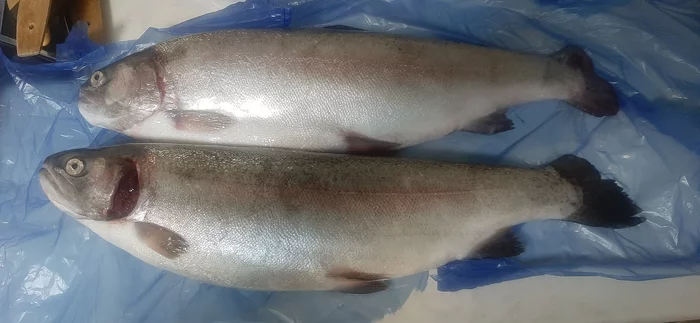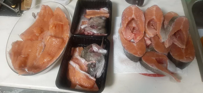 Вот результат безотходной технологии, головы и хребты пойдут на суп, хвостовая часть на малосолку(мне можно если не сильно соленое, а мы сильно не солим), остальное на стейки, стейки получаются зачет
