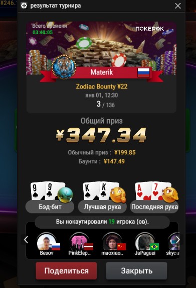 Планировал поспать и сеть в субботу вечером мистери покатать, но тут написал менеджер обменника, что в мне полагается билет на фрирол на битву покерок отборочный, пришлось катать, чутка не дошел, вылетел вроде в топ 40 при 24 проходках, переросло в вечернюю сессию, в итоге уставший отыграл плохо.