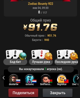 Остаток стека слил на мб, у меня 33, я лимп, ББ пуш, там 72о, ривер 7. После этого я просто выключил комп, тильтанул знатно, да и похрен. Доигрываю остатки что есть на счету в этом казино и нафиг, будут без моих денег....Лучше ПД поиграю...