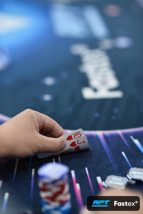 Андроник Чолокян из UTG порейзил 10,000, следом за ним Сергей "Основатель системы Чанцева" Чанцев ответил 3-бетом 25,000, Дмитрий Беликов с малого блайнда - 4-бет оллин 140,500. Рейзер самоликвидировался, а Чанцев попросил узнать точный размер стека Беликова (с его слов, чисто для себя) и заколлировал на стек 116,500.