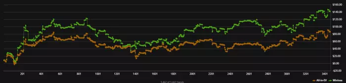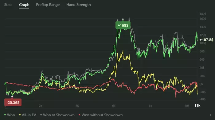 Вообще, влияние дисперсии приличное, стрик характеризуется не только тем, что идёт недобр по EV, но и попутно отвратительно сдают, всем всё доезжает таким образом, что это не отражается на EV, кажется, что все делаешь неправильно и мимо и через какое-то время становится трудно держать свою игру. Потом снова попускает и ты очень ловко флоатишь, стилишь, ставишь контбеты и пр. Поэтому в стрике трудно понять, что ты делаешь не так и насколько это «не так» влияет на винрейт.