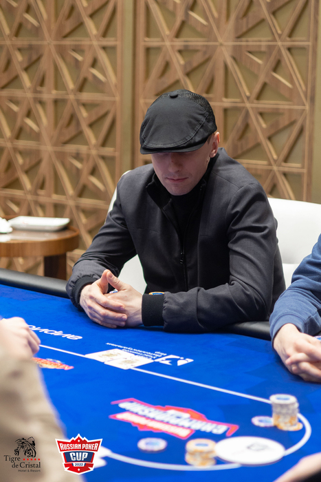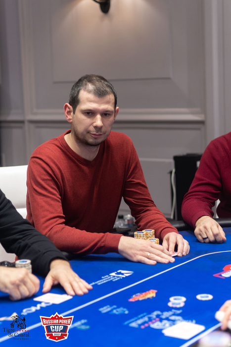 В последней раздаче перед перерывом чиплидер Артем Фасхутдинов удвоил обладателя самого короткого стека Евгения Шитикова: < по 56,000. А за соседним столом вылетел Альберт Кариус.