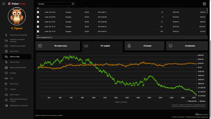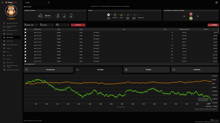 Вот читаю и всё больше убеждаюсь в том что PokerOk помойка, возможно конечно у кого-то ГСЧ работает как надо, но у меня происходит такое, что трудно представить такие ситуации на таких коротких дистанциях, попробовал поиграть в AoF на их честном ГСЧ, итог на скрине.... Я конечно понимаю что бываю стрики, но не по 80 баинов на 2800 рук... Не играйте в этой помойке, стандартно дают чуть выиграть и начинается жёсткий слив, что-бы я не делал это не победить. EV ещё не показывает рейк, не показывает подставные раздачи, когда например 3-4 раза подряд тебе сдают ТТ-JJ-QQ-KK на 4max столе и упарывают их в пару выше, при этом обратного не происходит.