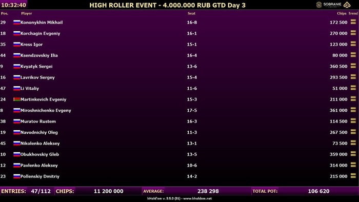 3) 13:00 High Rollers Event Day 3. Многодневный турнир с ТВ трансляцией финального стола. В формате 8 макс. Один из главных и дорогих турниров на серии. Бай-ин 1,100 у.е. Гарантия 4,000,000. Стартовый стек 100,000. Регистрация открыта еще 2 уровней по 45 минут. Игра продолжится до образования 2 столов.