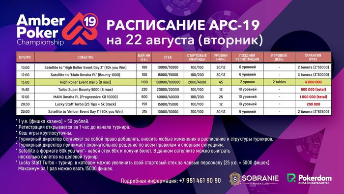 7) 23:00 Сателлит на Amber Event Day1. Формат сателлита, набейте стек 60,000 и получите билет. Бай-ин 315 у.е. Гарантия 2 билета стоимостью 1,650 у.е. Поздняя регистрация 6 уровней по 20 минут. После закрытия регистрации уровни по 12 минут.