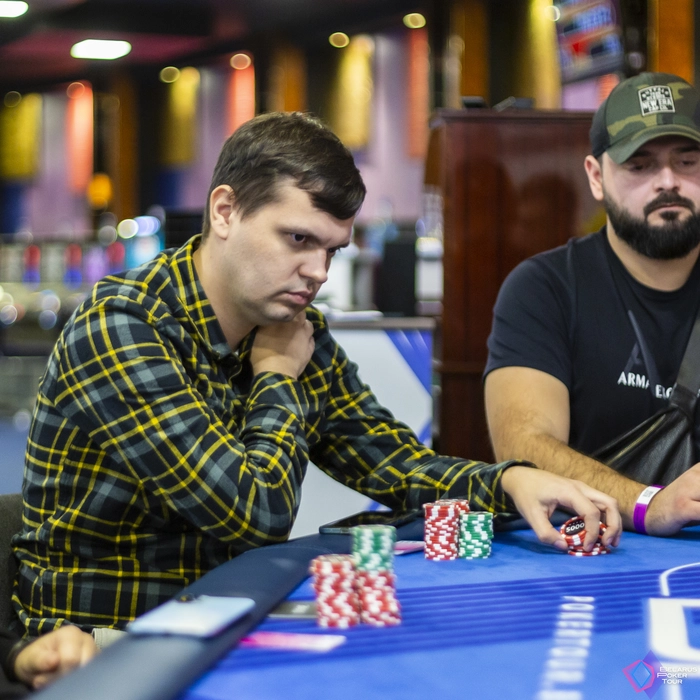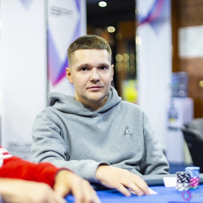 За соседним столом в это время префлоп столкнулись Павел Пономарев и Руслан Маисеенко. Павел выставился сильно снизу с в . Наловить свои 2 аута не смог.