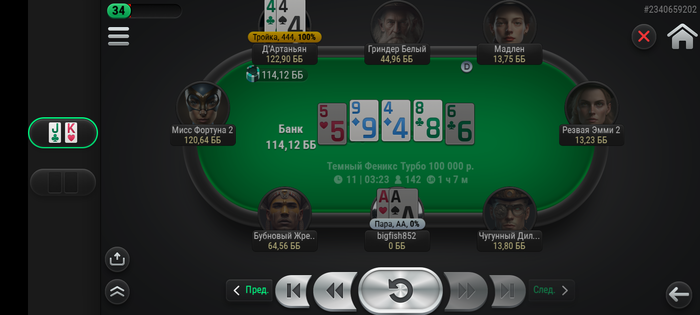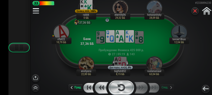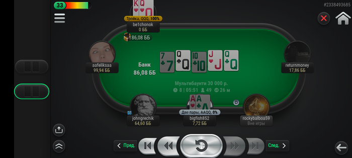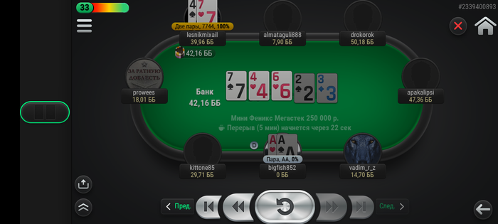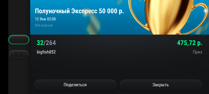 Худо бедно с телефона съел 8 турниров. Зацепил финалку, где поделили на троих по итогу.