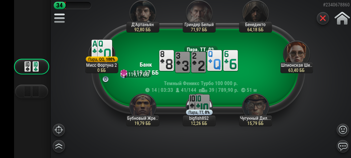 По игре ничего интересного. Пока в разгоне, компьютер не перевёз ещё на квартиру, поэтому вынужден играть с телефона, а это 3 стола максимум.