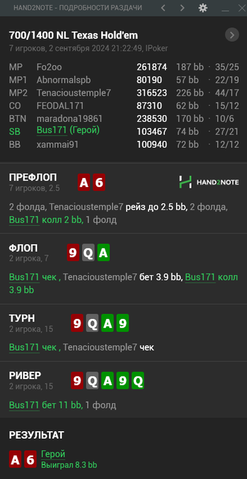 А чтобы вылететь из любимого 10ти часового в Покеркинге мозг придумал замискличить, вместо опенрейза люто(с) запихав 26 бб с K6s в 4ых, один из которых был в ситауте, а другой нашел восьмерки. Спокойной ночи.)