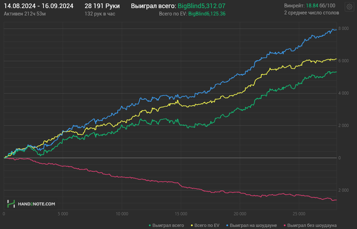 avt08us, лютый переАп. Винрейты космос. Просто дистанция 300 туриков . Когда будет 3000 - все винрейты упадут капитально. Особенно на BB🤣. В МТТ надо уметь играть на блинах и против них. Вот и вся наука. Но....ты можешь быть хорошим по винрейтам,но дико катать в минус по пол.года,особенно если высокий АФС. Когда диспа начинает "неистово трахать" в поздних стадиях, а фиши и минусовые стримеры будут лаково доезжать в свои сраные несколько аутов на ривере. И такая дичь творится сессия за сессией и кажется никогда не дождешься хорошего РАНа. Вот тогда будет проверка на железобетонность характера. А тут как раз большой мейк и пора бы заплатить за квартиру и взять покушать.