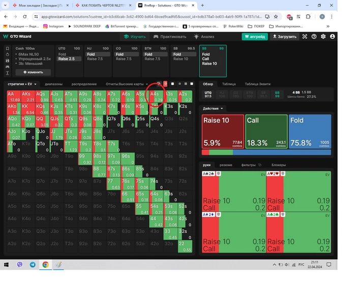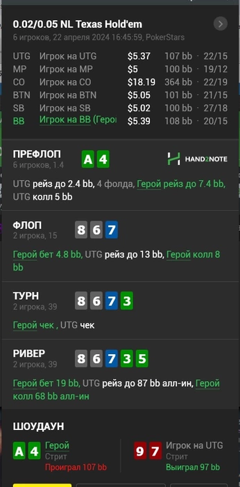Abaddon70 @ 22.04.24ВОТ КАК РАЗ Я ОБ ЭТОМ И ДУМАЛ= c диапозоном он рейзить на флопе мог только высокие пары, я даже по его диапозону сетов у него не вижу на флопе конкретно. поэтому и принял решение уравнивать на ривере, потому как считал, что после рейза флопа у оппа могут быть АА, КК, ДД, ВВ, но сук-а, 97. х-й знает. Скорее всего я точно ну них-я уже не понимаю. а то чарты и тд от гринов (нет там 97 на утг от слова совсем)