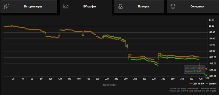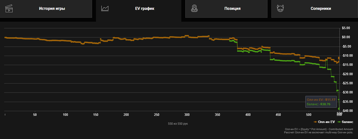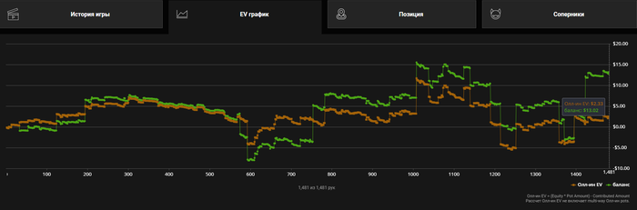 Всем привет. Ну такие американские горки сегодня были просто пиз.ц. В пике шёл - $20. Отбился стопну, отдохнул опять сел опять то минус то + по итогу стопнул так. Сегодня последний день халявы с конфетами. Был бы нехеровый плюс. Но есть уникальные фиши которые не пасуют когда у тебя на флопе нац сэт и ривером они дотягивают своего А в 2 аута. Так было проиграно 4 банка. фарманул очков в турик. поглядим может там чутка насрёт. Но это не точно. Очень сильно устал. Всем пока.
