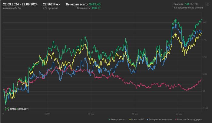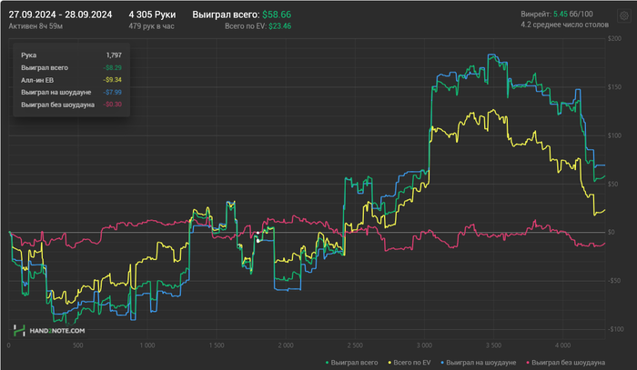 Графики... Вот с ними интереснее. Я заметил, что чет как-то не сходиться. И да, h2n3 немного ...издит. Какие-то руки не считывает правильно (3 борда, например). Какие-то руки просто теряет. А ещё мудрит с рейком. Как итог, более опытные игроки посоветовали занижать видимые рез-ты h2n3 на 15%. А также вроде как часть выше описанных проблем решает h2n4. Перейду на 4ку или нет, я пока хз.