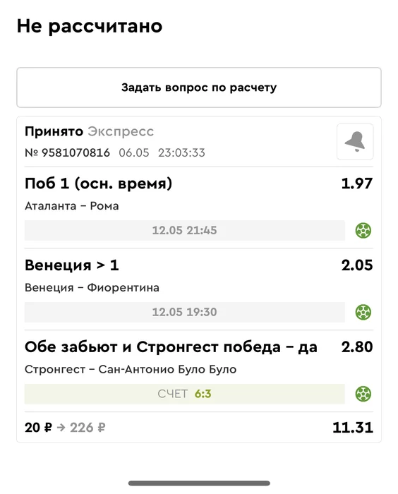 06.05.25 проигрыш по всем мини экспрессам. Итого банк -60 ₽ 4676 ₽ - 6,48%. Экспресс8 -3,08 флета, тот+исход -10,68 флета, тотал - 2,9 флета! все экспресс недели и мини экспрессы кроме тотала сошли с дистанции.