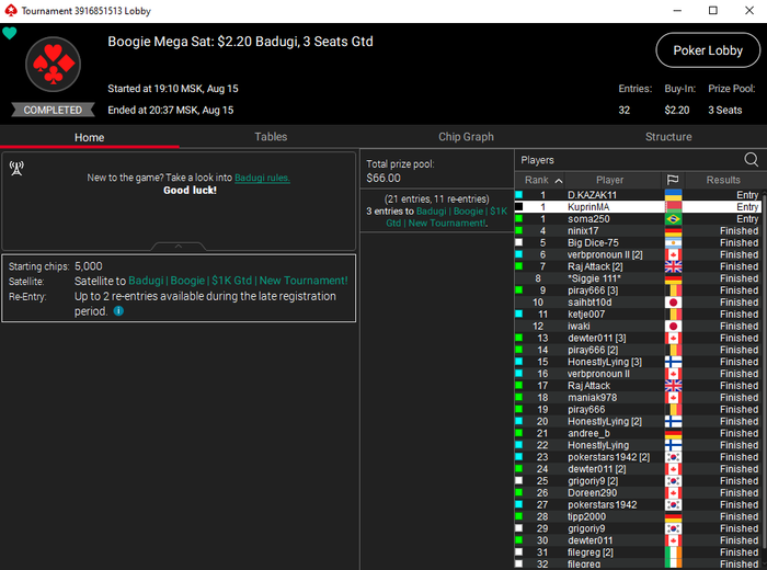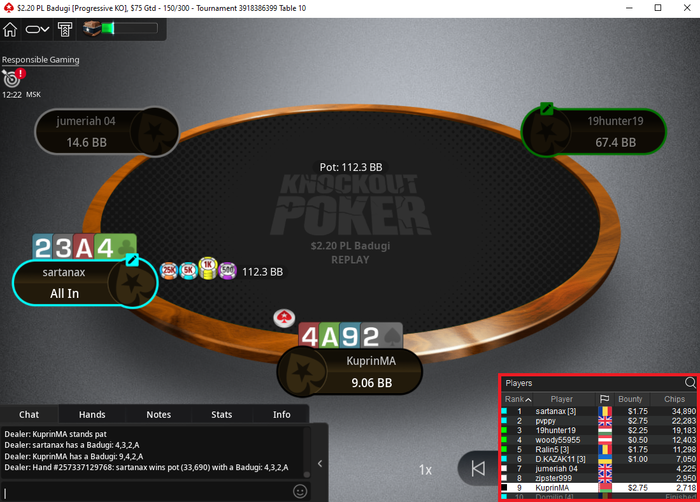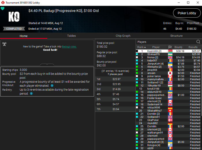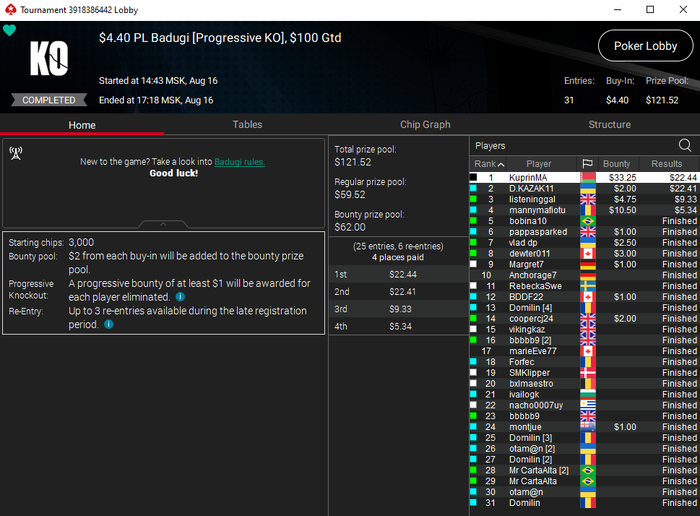 В бадуги на 22$, как я уже упоминал выше, отобрался через сат. В самом турнире долгое время шёл на 1-ом месте, сделал пару ноков, но потом снова два раза перекупили последним обменом.