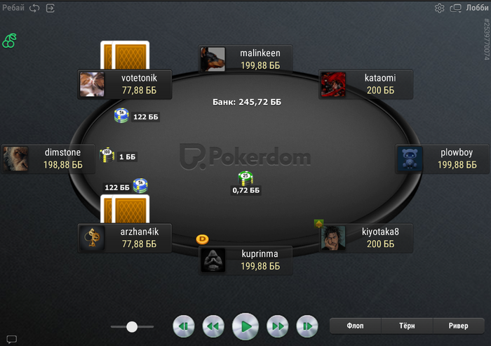 В РОПЛ-01 иду в топ-20 в килополяне, но там ещё всё вилами по воде... Я сколько не играл в холдем на ПД, всегда считал этот рум самым слабым по составам. Первая раздача турнира добавила оптимизма. В стеках по 200 бб чел с УТГ опен-рейз 122 бб (!!!) с АКо, на МБ колл с JTo. Ну и на флопе Q59 уже доставили свои "крохи" по 78 бб...